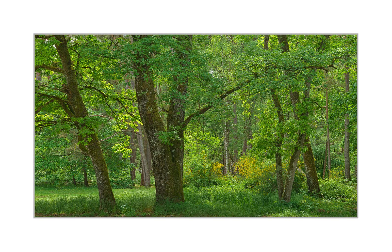 The woodland stands fresh and full, its canopy alive with the vibrant greens of late spring. Shafts of soft light slip through layers of foliage, casting a gentle radiance over the grass below. Mature trunks rise in quiet harmony, their bark textured with age, while golden broom flowers flare in the understorey, adding warmth to the cool shade. This is a place between moments—where stillness meets growth, and the season breathes gently through every leaf.