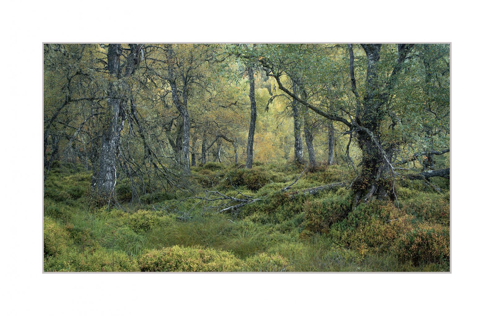 A quiet tangle of birch trees, their silvered trunks draped in lichen, stands deep in a Highland woodland. Autumn’s early touch has begun to soften the greens with hints of amber and ochre, while the mossy floor lies undisturbed—thick with heather, grasses, and fallen limbs slowly folding back into the earth. Light filters gently through the canopy, illuminating a stillness that feels both ancient and alive. This is not a place for hurried footsteps, but for standing still, listening, and seeing.
